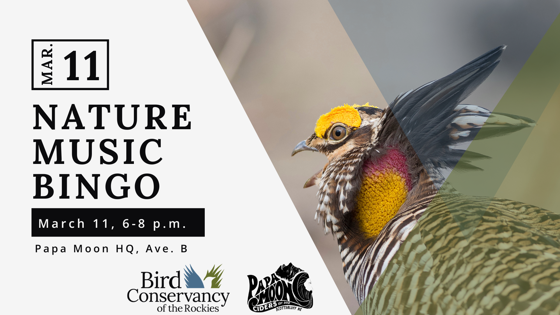 Bird Conservancy of the Rockies is excited to partner with Papa Moon Craft Ciders, AGAIN, to bring you more Nature Music Bingo! What does Nature Music Bingo mean? There will be music with “nature” words in the song title and artists' names, OR actual calls from some of our local western Nebraska wildlife. You may hear chickadee calls, music from artists like The Beatles or Cage the Elephant! No cost to play. Phones and apps like Shazam and Merlin Bird ID (for sound identification) can help you identify songs. Bring your friends, family, and music & nature nerds to enjoy this interactive edition of Nature Music Bingo at the Papa Moon HQ on Avenue B.