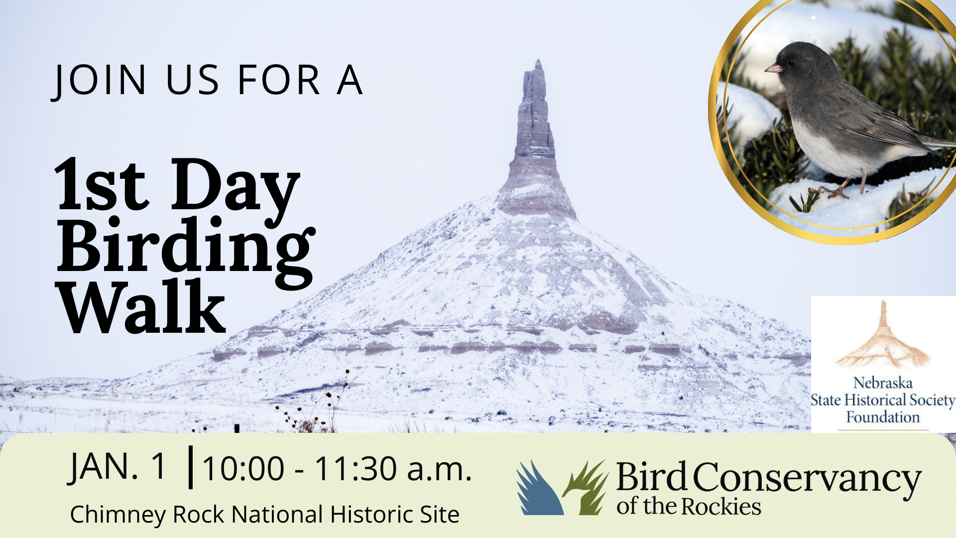 Kick off the new year with a refreshing and invigorating 1st Day Birding Walk! Join Bird Conservancy of the Rockies and the Nebraska State Historical Society Foundation for a delightful morning of birding. Whether you’re a seasoned birder or just starting out, everyone is welcome to this community event. Come for a little while or stay as long as you’d like! Discover the winter beauty and diversity of our local bird species as we take a leisurely stroll along the Chimney Rock path. We have binoculars and field guides available to use during the walk. Be sure to dress for the weather, as we’ll be outside the entire time enjoying the crisp winter air. We’ll stay cozy with plenty of hot cocoa and tea. Binoculars and field guides will be available to borrow. Click here to register! https://www.birdconservancy.org/event/1st-day-birding-walk/ The 1st Day Birding Walk will be gathering at the Chimney Rock walking trail, 7353 County Road 98, Bayard, NE 69334. For more information (308) 633-1013. All are welcome. Our community of practice is to be an organization that empowers people of all backgrounds, beliefs, colors, and creeds to join in, benefit from, and contribute to our mission. We strive to ensure everyone feels safe and included at our programs and events, and can find a place for themselves in nature.
